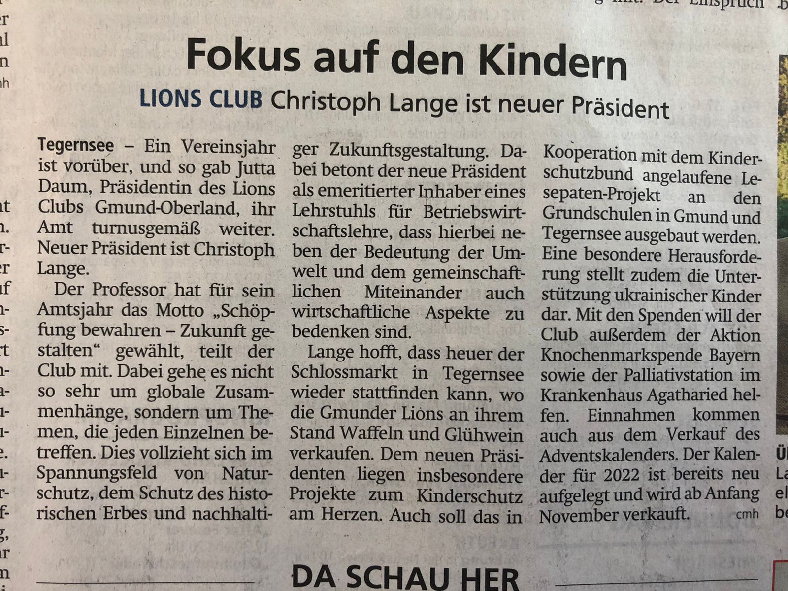 Dem neuen Präsidenten liegen insbesondere Projekte zum Kinderschutz am Herzen. Auch soll das gerade (in Kooperation mit dem Kinderschutzbund Miesbach) erfolgreich angelaufene Lesepatenprojekt an den Grundschulen in Gmund und Tegernsee ausgebaut werden. Eine besondere Herausforderung stellt dabei die Unterstützung ukrainischer Kinder dar.
